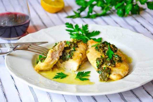 Петрушку вымыть и мелко порубить. При подаче куриные грудки полить получившимся соусом.