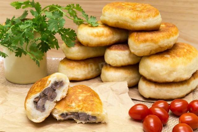 3. Тесто делим на равные части (17-18 кусочков должно получится), из каждого кусочка формируем руками лепешку, по центру выкладываем начинку, защипываем, формируя пирожок. Жарим пирожки на растительном масле с обеих сторон до румяности.