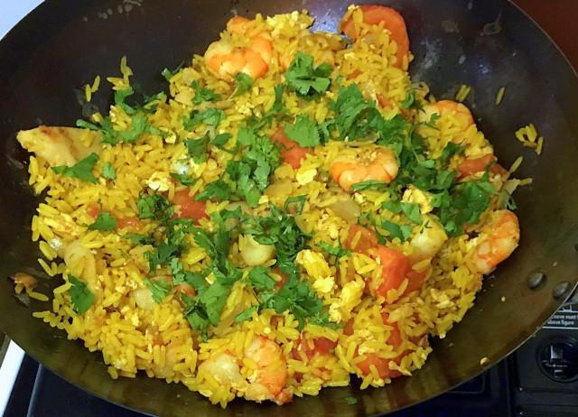 Жареный рис с морепродуктами по-тайски на сковороде вок