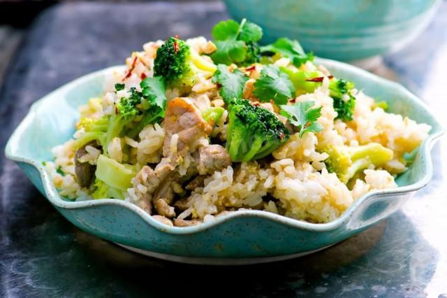 7. Добавить рис и брокколи, перемешать и готовить 2 минуты.