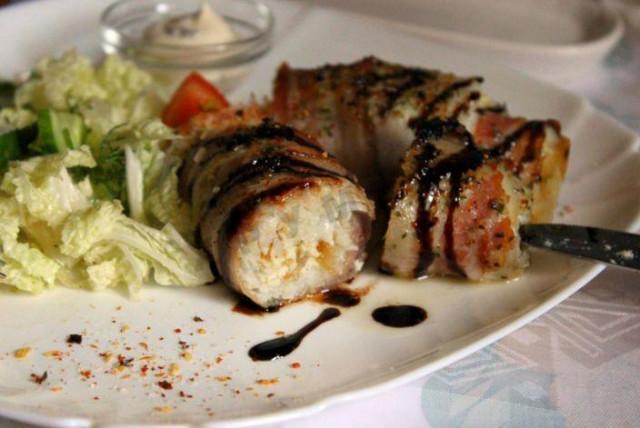 Положить десертную ложку начинки на рыбное филе, свернуть рулетом. Завернуть в полоски бекона.