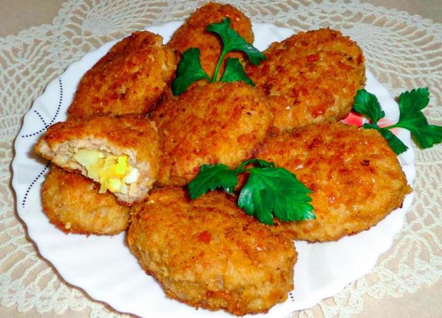 На плоскую тарелку насыпьте панировочные сухари. Берите руками, смоченными в воде, сырой фарш, формируйте из него шарик. Затем сплющивайте его в лепешку. В центр лепешки выложите начинку из вареного яйца и лука. Делайте зразы нужного вам размера. Я обычно беру 2 столовые ложки фарша и 1 чайную ложку начинки на одну зразу.