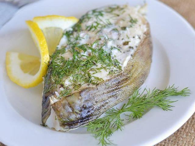Подавайте готовую рыбу со свежей зеленью и ломтиком лимона.