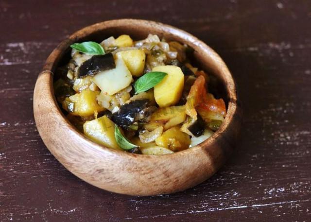 Баклажаны выжмите либо вручную, либо при помощи специального пресса, чтобы ушла лишняя горечь. Обжарьте их на растительном масле в сковороде. Потом отложите обжаренные баклажаны в сторону, и обжарьте картофель почти до готовности. Мелко нарежьте чеснок и зелень. Добавьте картофель к обжаренному луку, перцу и помидорам. Потом добавьте баклажаны и зелень, посолите и поперчите. По мере надобности добавьте немного воды, тушите минут 10-12.