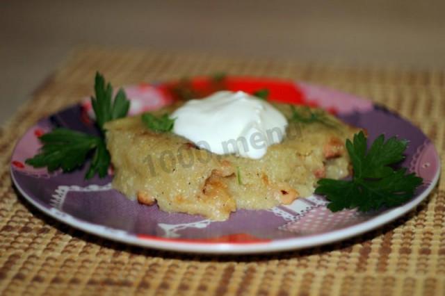 Добавляем обжаренный лук с грудинкой к картошке, все хорошо перемешиваем