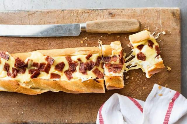 Готовый багет нарезаем на порционные кусочки и сразу же подаем к столу, пока он не остыл!