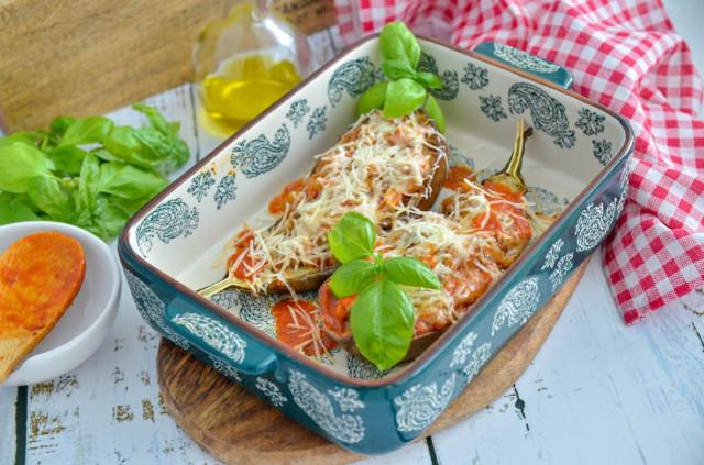 Наполните получившемся фаршем лодочки из баклажанов. Сверху обильно посыпьте их пармезаном. Немного пармезана оставьте.