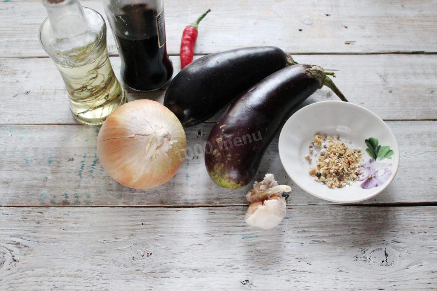 Для приготовления этого блюда возьмите баклажаны, репчатый лук, чеснок, острый перец, соевый соус, подсолнечное масло, пряности (у меня смесь пряностей для тушения овощей Юлии Высоцкой, вы можете выбрать любую, ориентируясь на свой вкус).