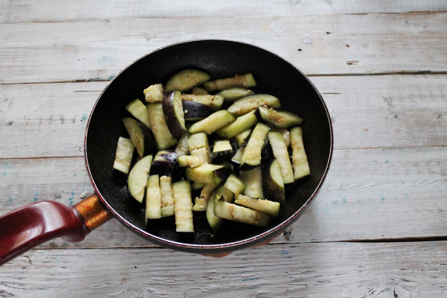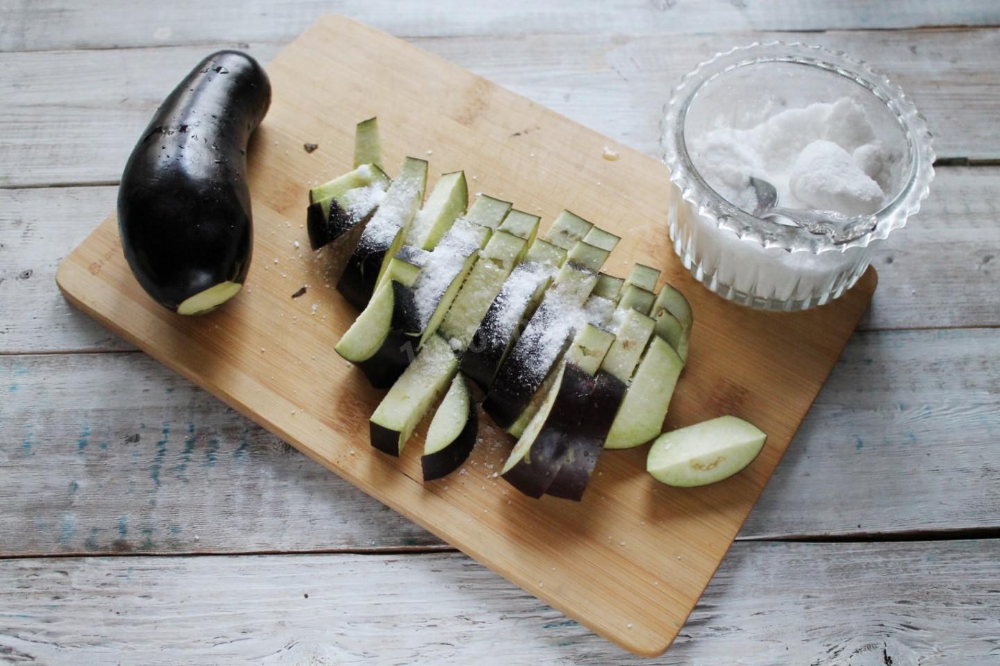 Баклажаны помойте, порежьте пластинами, а потом еще поперек брусочками. Присолите и оставьте минут на 5-7, чтобы вышла горечь. Затем промойте баклажаны с помощью сита или дуршлага, хорошо отожмите от влаги.