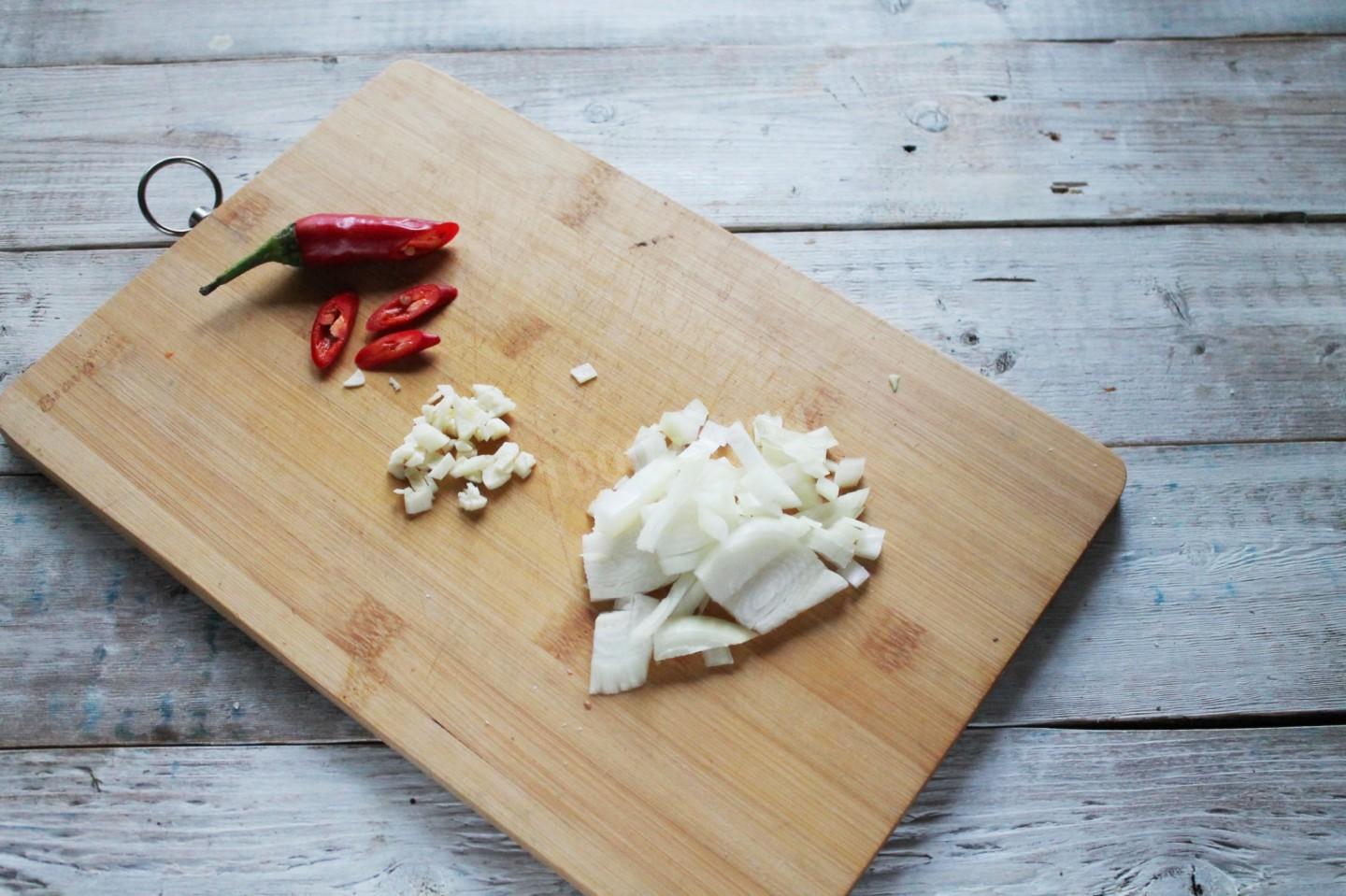 Мелко нарежьте лук, раздавите зубчик чеснока, отрежьте 2-3 тонких кружочка острого перца.