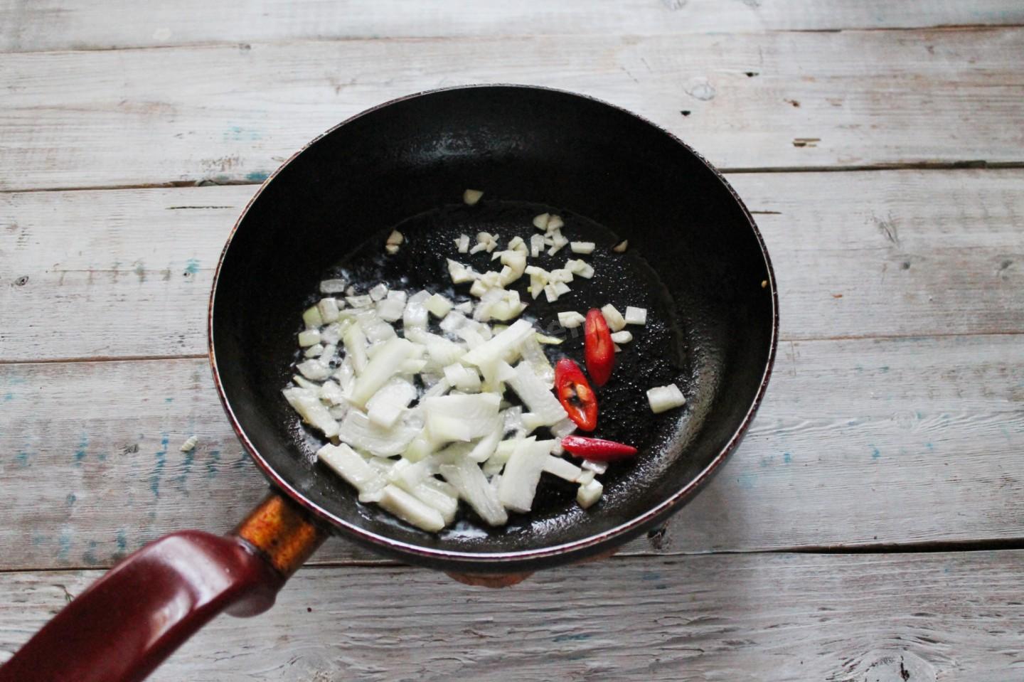 На той же сковороде, добавив ложку масла, немного потомите лук, чеснок и острый перец. Масло впитает все ароматы.