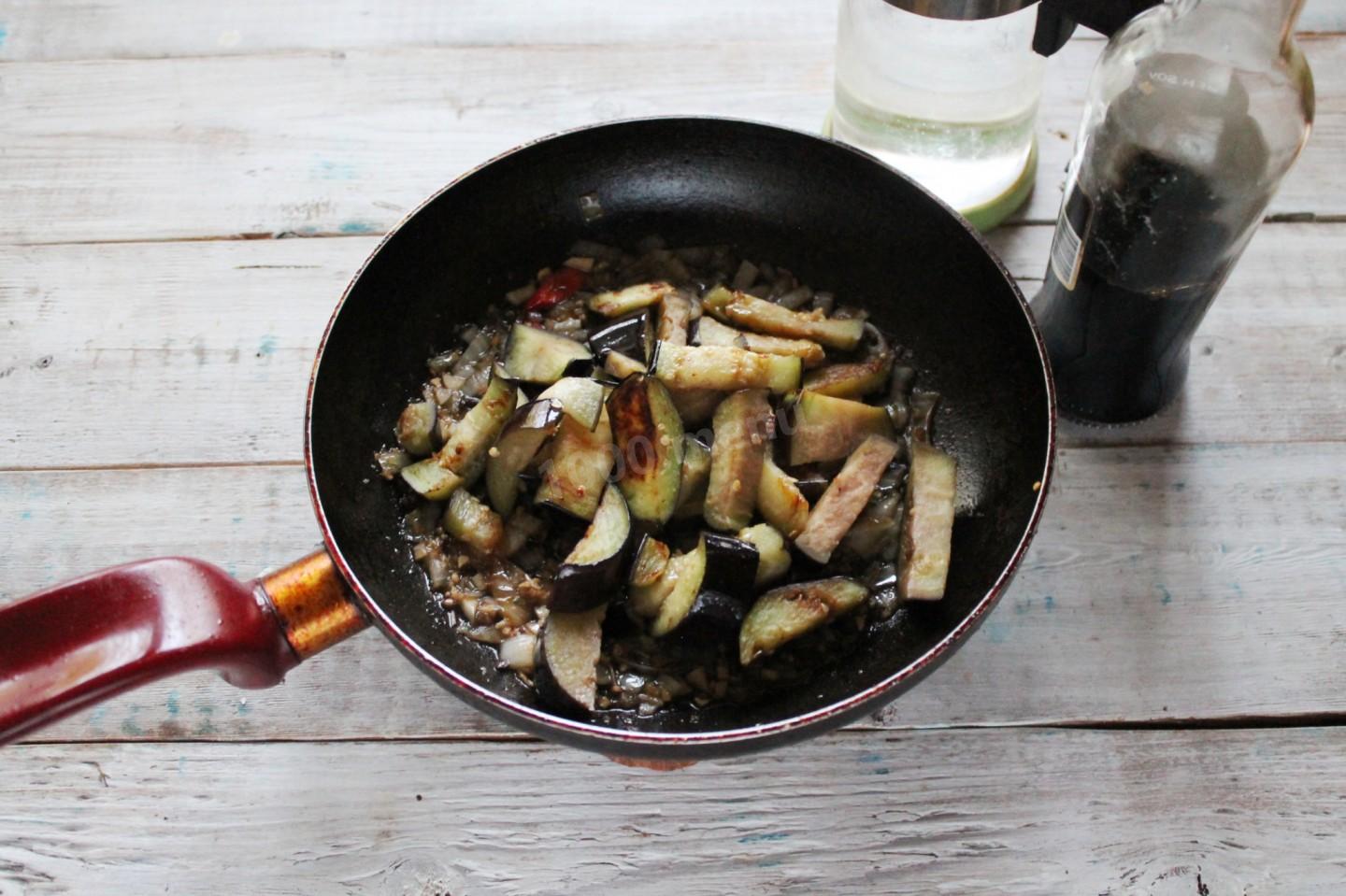 Опустите в полученный соус обжаренные баклажаны и готовьте до полного испарения влаги.