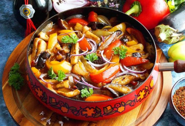 Лук, чеснок и имбирь очистите от кожуры. Все овощи ополосните в чистой воде и обсушите бумажными салфетками. У баклажанов срежьте места крепления плодоножки. Болгарские перцы разрежьте пополам и удалите сердцевину с семенами. Если вы возьмёте перцы разных цветов, тогда ваше блюдо получится невероятно яркое и аппетитное.