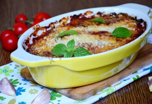 Слои повторяем до тех пор, пока не заполнится форма полностью. Последним слоем у нам будет томатный соус и сыр, а также измельченные белые сухари. Запекаем баклажаны в разогретой до 180 С духовке около 30 минут.