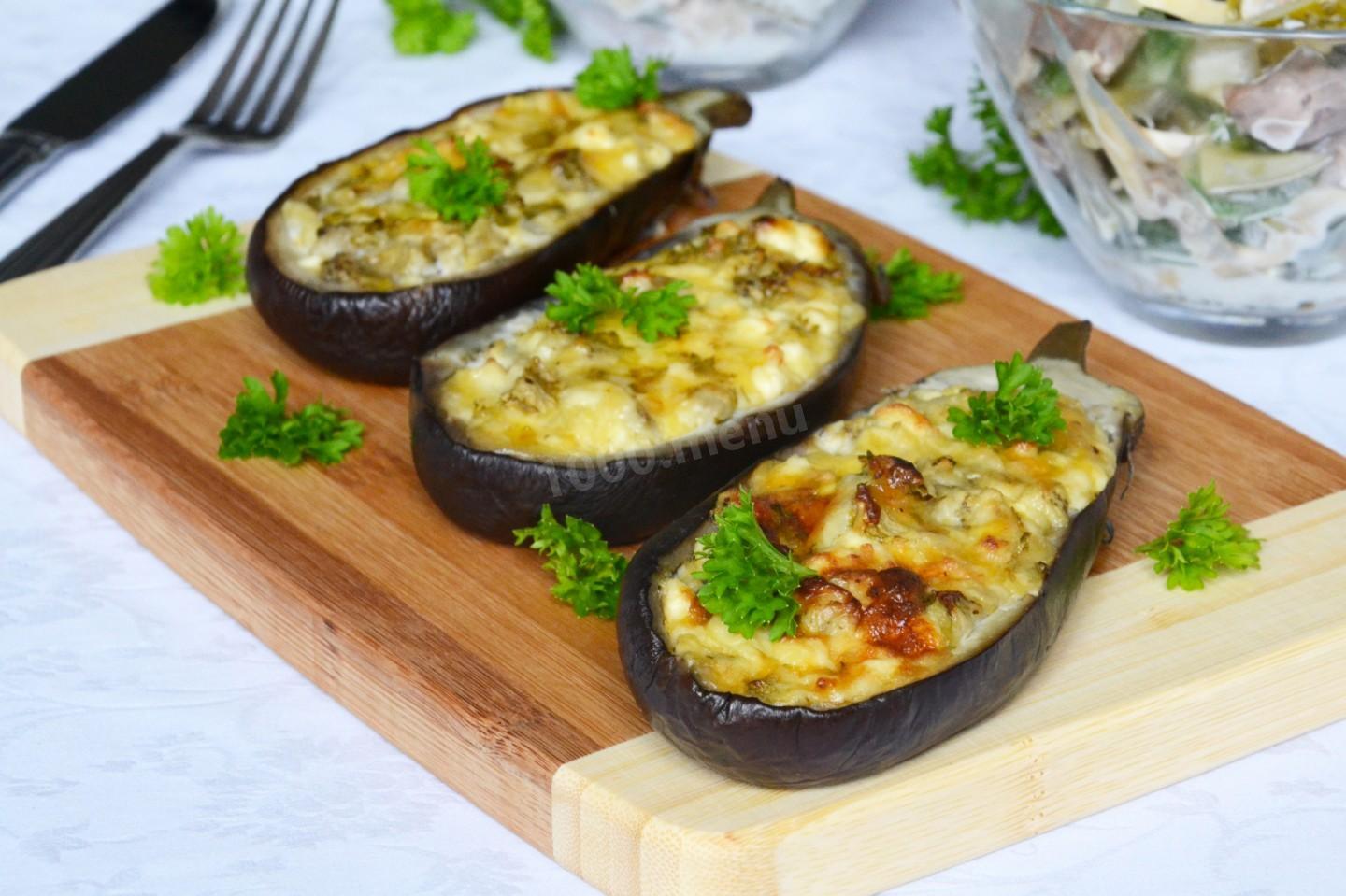 Заполнить баклажаны начинкой и выложить в форму для запекания. Запекать 30-35 минут при 180°С.