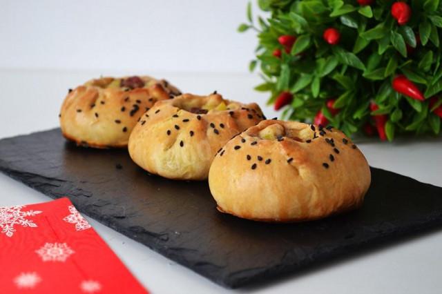4. Переносим балиши на противень, выстеленный пергаментом, смазываем взбитым яйцом, посыпаем кунжутом и отправляем в духовку, разогретую до 180 градусов на полчаса. Затем извлекаем противень из духовки, наливаем в каждый балиш по паре столовых ложек бульона и возвращаем в духовку еще на 10 минут.