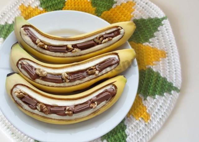 Бананы вымойте, вытрите насухо, положите на плоскую тарелку. Аккуратно вырежьте сверху кожуру, сделайте продольный разрез примерно до половины мякоти банана. Шоколад поломайте на кусочки, вставьте их в разрез - на каждый банан 40 грамм шоколада, между кусочками шоколада - орехи. Кстати, орехи можно и не добавлять.