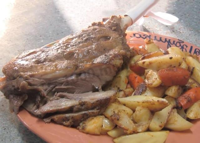После этого мясо нужно переложить на противень и немного полить оливковым маслом. Затем мелко нарезаем чеснок и шпигуем им лопатку. Заворачиваем мясо в фольгу и ставим в хорошо разогретую духовку (170 градусов) для запекания на 1,5-2 часа. Примерно за полчаса до окончания приготовления фольгу нужно аккуратно снять и проткнув вилкой мясо проверить степень его готовности. Если оно еще жесткое, значит нужно продолжить запекание. При подаче мясного блюда на праздничный стол, его по желанию можно украсить овощами и зеленью.
