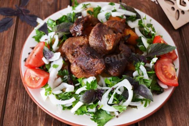 8. Готовый картофель перчим и солим по вкусу, приправляем зирой, соединяем с бараниной, выкладываем на большое блюдо, вокруг посыпаем маринованным луком с зеленью.