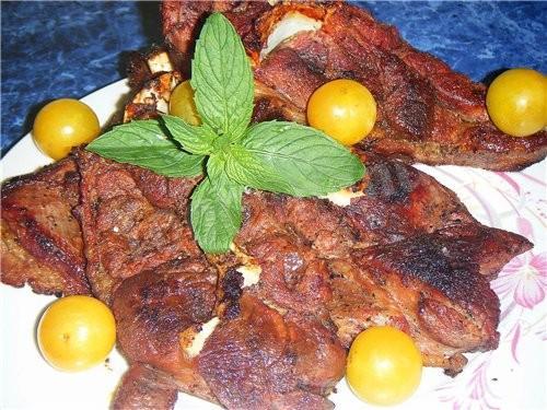 Сегодня готовим пьяненького барашка. Лучше всего для этой еды брать баранью лопатку. Режем ее на порционные куски. Солим, перчим, добавляем приправки. Выжимаем сок лимона. Укладываем в чашку и смело заливаем пивом. Перемешиваем. Это такой маринад, оставляем мариноваться на ночь. Утром маринад сливаем в форму для запекания, а мясо вытаскиваем. Еще разок посыпаем специями для баранины, паприкой. Из алычи удаляем косточку. Можно натереть на терке, можно просто разломать и отправить в мясо. Но лучше все же каким-то образом получить из алычи сок)) И не просто побросать кусочки ягод к мясу, но залить мясо кислым соком алычи. Мясо вернуть в маринад. Добавить перчик чили (да, приправ требуется очень много, но не переборщите!). Ставим в разогретую духовку, выпекаем в течении получаса (до появления золотистой корочки). Далее накрываем фольгой и продолжаем запекать до готовности.