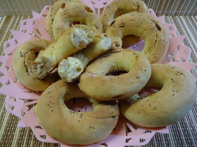 Каждый кусочек раскатать в колбаску и сформовать баранки.Часть можно оставить колбасками / детям нравятся такие "сигары" - их удобно макать во вкусняшку /.