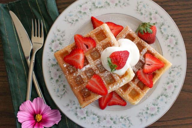 Готовые вафли можно подавать к столу как теплыми, так и холодными, украсив их на свой вкус. Хорошо с ними сочетаются различные сиропы, взбитые сливки, мороженое, шоколад, кусочки свежих ягод и фруктов, но можно подать их просто с вареньем или медом или посыпать сахарной пудрой для красоты.