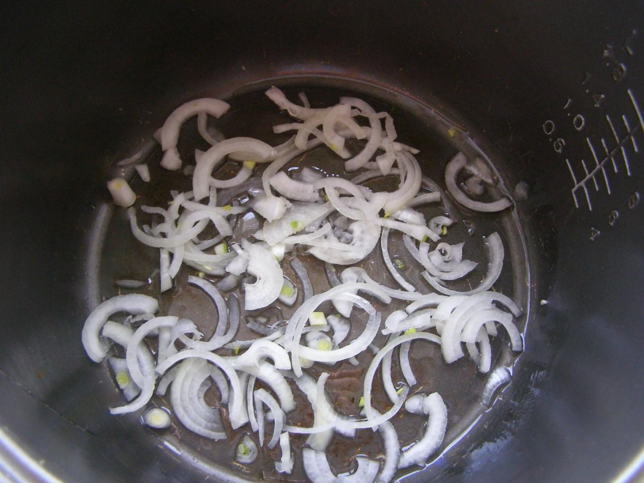 Лук уже можно отправлять в масло. Накроем мультиварочку крышкой и готовим лук в этом режиме. Пяти минут с лихвой хватит, иначе подгорит!