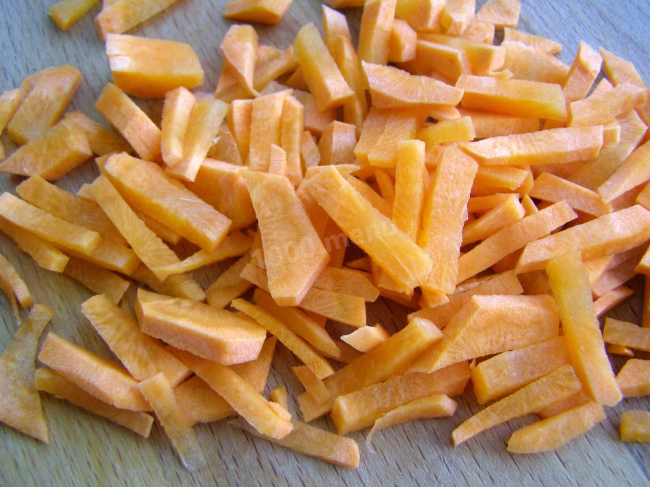 Формат нарезки морковь тоже может быть разный – все зависит от вашего отношения к ней. Посему или на крупной терке натрите, или через другое приспособление пропустите, если не хотите соломкой резать.