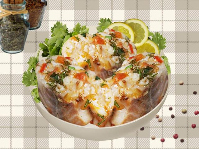 1. Рыбу моем, нарезаем на порционные кусочки. Смазываем горчицей, солим и перчим. Оставляем на час промариноваться. Пока рыба маринуется, займемся приготовление овощей.