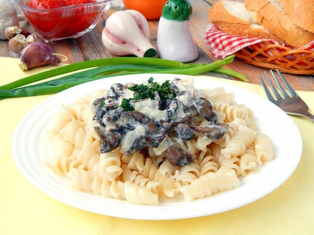 Затем к репчатому луку отправляем грибы, перемешиваем и жарим их вместе на среднем огне еще около 5 минут. Затем добавляем соль, черный молотый перец по вкусу. Можно добавить пару листочков лавра, он придаст приятный аромат вкусу, после приготовления блюда лавровый лист нужно убрать. Заливаем содержимое сковороды сметаной. Сметану лучше использовать жирностью 15 %. Если сметана более густая, то можно развести ее небольшим количеством воды.