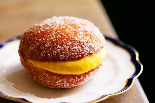 5. Готовые пончики окуните в сахар и разрежьте пополам. Смажьте одну половинку джемом и покройте щедрым слоем крема. Накройте второй половинкой пончика.