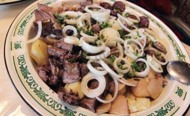 9. По краю блюда выложите картофель, в центр положите мясо. Сверху добавьте запаренный бульоном лук и рубленую зелень.