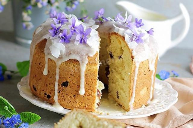 Для глазури берем лимонный сок, добавляем немного воды, и смешиваем его с сахарной пудрой до однородного состояния жидкой сметаны. При желании сок можно заменить на апельсиновый или грейпфрутовый. Остывший кулич поливаем глазурью, а когда она застынет, украшаем на свой вкус.