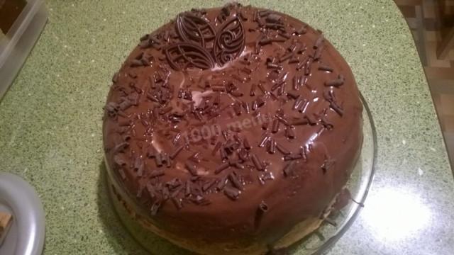 Я разделила пополам, смазала нижний корж заварным ванильным кремом и сверху покрыла шоколадной глазурью. Получилось нарядно и очень вкусно.