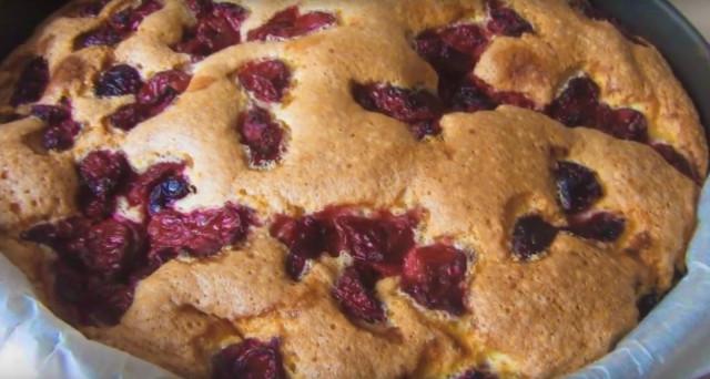 Сверху выкладываем вишню (если вишня заморожена, нужно ее выжать от лишнего сока). Выпекаем при температуре 180 градусов 35 минут. Готовность проверяем деревянной палочкой или ножом.