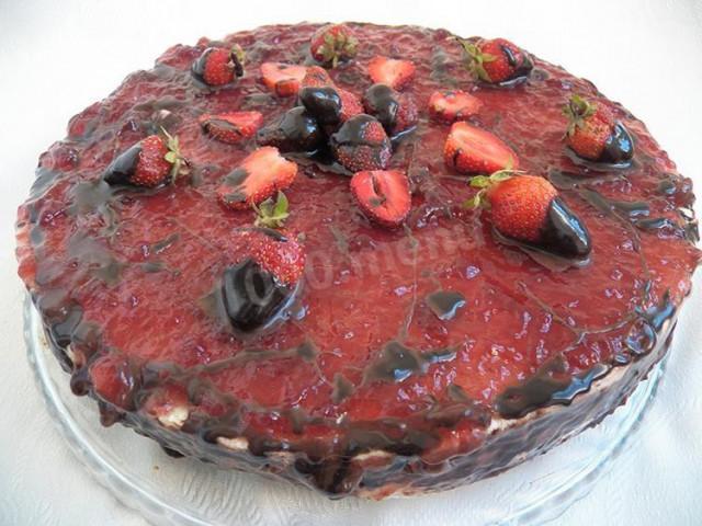 Ну, а теперь самое интересное, мне так хотелось украсить торт клубничной заливкой( ну а разъемной формы у меня нет), что я подумала и сделала так: процедила клубничный отвар, добавила вино и готовый желатин (из 3-х столовых ложек). Положила этот раствор в холодильник . Как только он стал сгущаться, быстро начала мазать им верхний слой торта. И получалось не гладко, а как бы кудряшками. И тут меня осенила мысль назвать клубничный торт “Кудряшка Клу”. Ну и под конец украсила его топленым шоколадом. Ну не рецепт, а ода торту получилась. Но он стоит того. Поверьте, было вкусно!