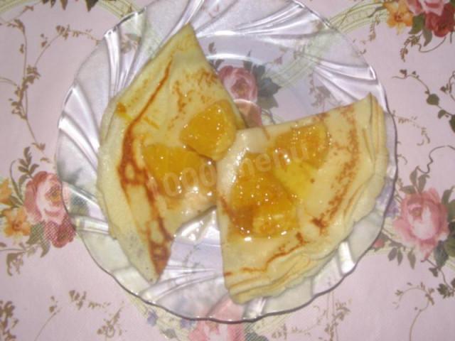 Смешиваем пшеничную муку, соль и столовую ложку сахара, а затем добавляем куриные яйца и перемешиваем до однородного состояния. В полученную смесь присоединяем ванилин, 2 столовые ложки растопленного сливочного масла и молоко. Тщательно смешиваем все компоненты и оставляем в теплом месте на 2 часа. Выпекаем тонкие блинчики на хорошо разогретой сковороде, смазанной сливочным маслом, с двух сторон. Приступаем к приготовлению карамели. Разогреваем сахар, добавляем к нему цедру и сок апельсинов, сливочное масло и половину порции коньяка и ликера. Полученную смесь варим на небольшом огне, постоянно помешивая, до образования однородной карамели. Каждый блинчик смазываем карамелью, складываем вчетверо и выкладываем на блюдо. Сверху выливаем остатки карамели. Смешиваем оставшуюся часть коньяка с ликером, нагреваем, а затем поливаем блинчики, перел подачей к столу поджигаем их. Блины французские тонкие готовы, приятного аппетита!