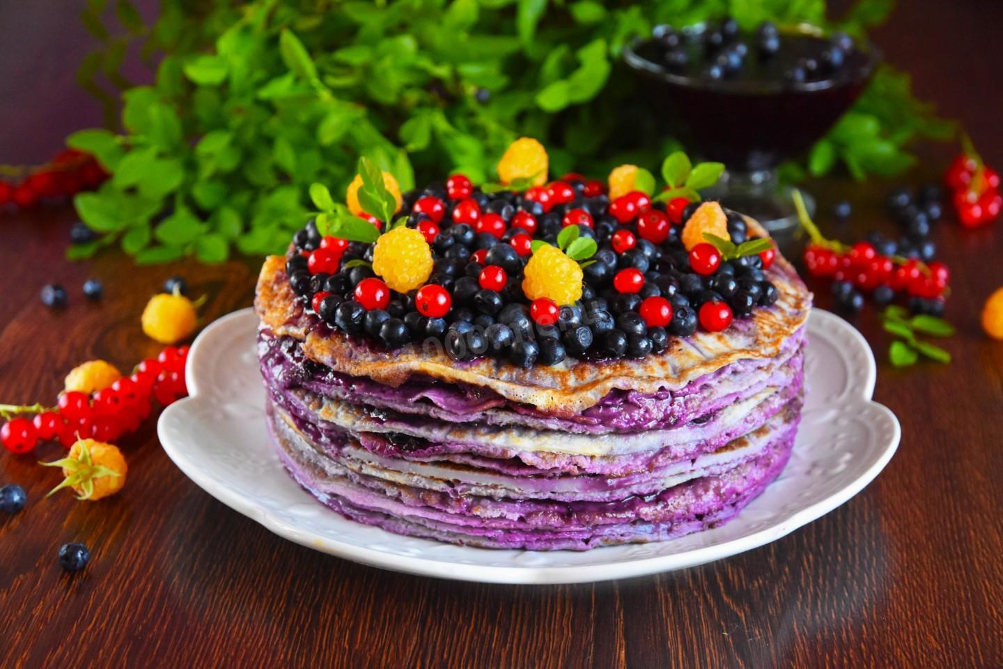 Соберите торт, промазывая каждый блинчик черничной начинкой и складывая стопочкой друг на друга.