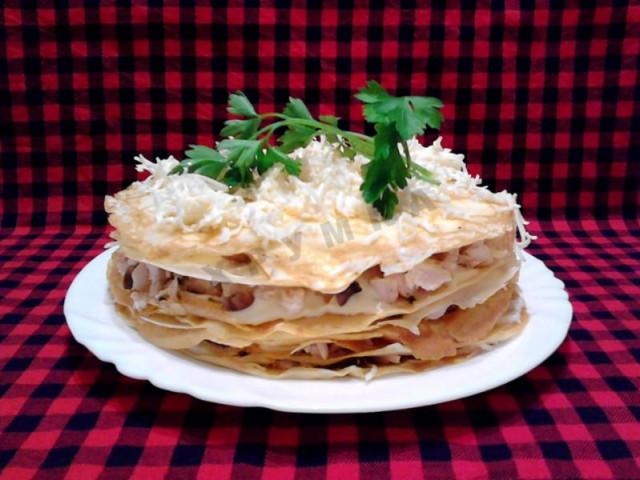 Порадуй гостей вкусным блинным тортиком с грибами. Блинный торт с грибами получается невероятно нежным, а отварная куриная грудка в начинке добавляет торту тонкого вкуса. В приготовлении начинки не используется лук и это делает его тающим во рту.