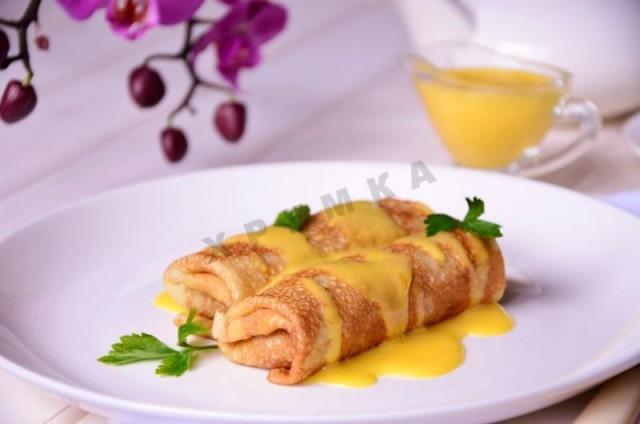 Выкладываем блины с грибами на блюдо, поливаем голландским соусом и подаем. Приятного аппетита!