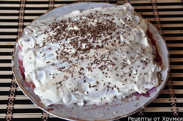 Блины: Разбить в посуде 5 яиц, присолить, добавить муку и перемешать. После этого добавлять молоко – тогда в тесте не будет комочков. В готовое тесто жидкое тесто влить растительное масло. Я жарю блины сразу в двух сковородах. Быстрей получается! В остывшие блины заворачиваю вишневые ягоды (сама консервирую вишню в собственном соку). Сметану беру или 15%или 25% жирности, чтобы она была не слишком жидкой. Взбиваю сметану с сахаром – и крем готов. Полученные блинно-вишневые трубочки укладываю на тарелку слоями, и каждый слой поливаю сметанным кремом. Слой за слоем растет моя «Шапка Гугуцэ»! Сверху присыпаю шоколадной стружкой – для красоты. Детям очень нравится не только кушать эту еду, но они с удовольствием и восторгом помогают заворачивать вишню и собирать саму «Шапку Гугуцэ». Попробуйте и вы! У вас получится семейный шедевр!