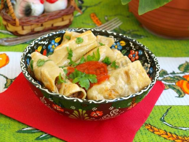 10. Поставьте трубочки в сковороду, залейте бульоном и на медленном огне доведите до готовности.