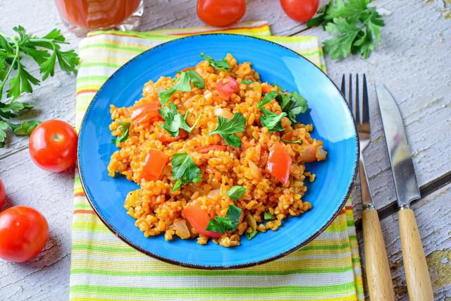 С томатным вкусом, на скорую руку, легко и просто! Булгур по турецки - это замечательный гарнир. В сочетании с соком томатов блюдо приобретает новый интересный вкус. Количество и состав овощей можно легко изменять под свои вкусы и предпочтения.