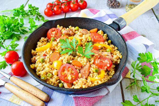 Яркий, вкусный, сытный, на скорую руку, на каждый день! Булгур с мясом свинины и овощами на сковороде - прекрасный вариант обеда или ужина для всей семьи. Эта крупа отлично сочетается с мясом и различными овощами! И готовится быстро!