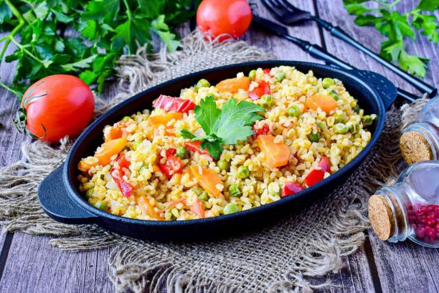 Насыщенный гарнир из крупы под любое мясное блюдо! Булгур с овощами на сковороде внесет разнообразие в ваш рацион. Таким гарниром можно дополнить любое блюдо из мяса, птицы или рыбы! И сам по себе он очень вкусный, подходит для постного меню.