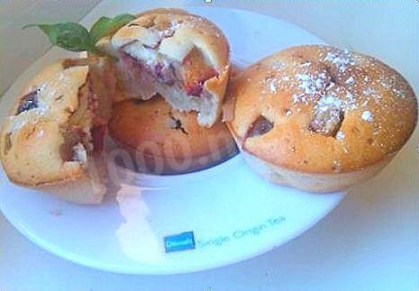 2. Заполнить тестом формочки (на 2/3), положить внутрь по кусочку глазированного сырочка и несколько кусочков слив.