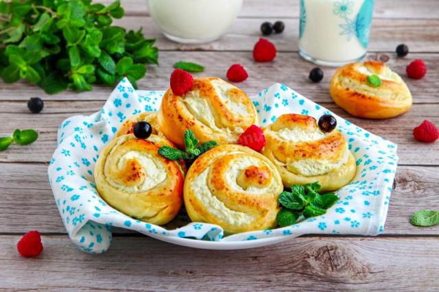 Пышные, нежные, сдобные, румяные! Вкусная домашняя выпечка! Хотите испечь плюшки с творогом из дрожжевого теста? Тогда запаситесь временем и терпением. Это тесто не терпит суеты и торопливости. А вот формировать булочки просто и быстро. Получаются они очень мягкими, нежными и вкусными!