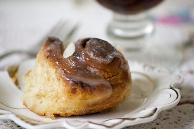 Для заливки я делала простую помадку: растапливаем сливочное масло, добавляем сахар и теплое молоко, размешиваем. Достаем ароматные булочки, обильно поливаем помадкой. Можно также украсить их сверху на свой вкус, например, очень красиво смотрятся миндальные лепестки.