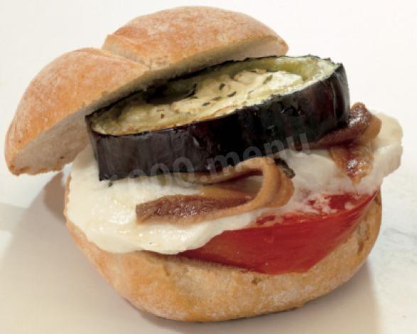 Далее, немного польём половинки булочек оливковым маслом и положим по ломтику помидора на каждую половинку булки. Посолим и поперчим. Затем сыр и анчоусы, а затем баклажан (так же можно немного поперчить) и накрываем второй половинкой булки. Один бутерброд готов. Таким же образом «собираем» и все остальные бутерброды, пока не используем все заготовленные продукты.