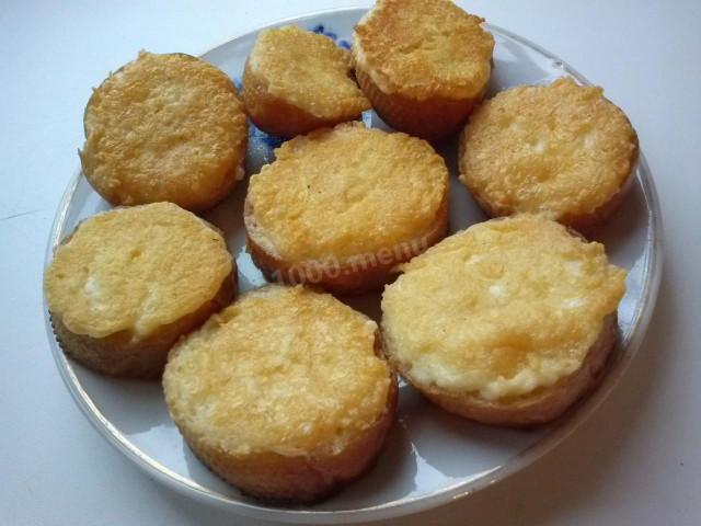 Натереть на мелкой терке сыр, разбить в него сырое яйцо, все перемешать. Пропорции я дала условно, масса должна получится плотной. Нарезать хлеб на ломтики, лучше не очень большие (у меня багет). Сырную массу намазать на хлеб, уплотняя ножом, и сразу класть на раскаленную сковороду, сыром вниз. Не бойтесь, сыр не отвалится, просто растительного масла должно быть достаточно. Жарить до румяной корочки, затем перевернуть и обжарить вторую сторону. Кстати, сыр можно мазать на обе стороны. Вот и все, можно завтракать.